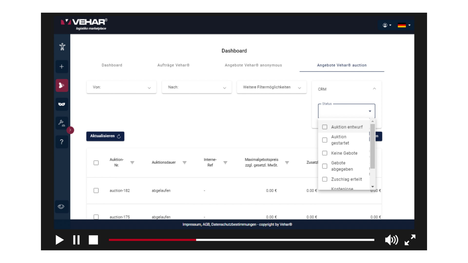 Mit Vehar auction kannst du deinen Transportauftrag auf einem Marktplatz anbieten, auf dem Spediteure um den besten Preis bieten. So erhältst du günstige Gebote von bewerteten Transportdienstleistern, während du von einer sicheren und kosteneffizienten Lösung profitierst. Egal ob Stahllogistik, Palettenversand oder Eiltransporte – du bestimmst die Bedingungen und sicherst dir das optimale Angebot.